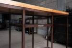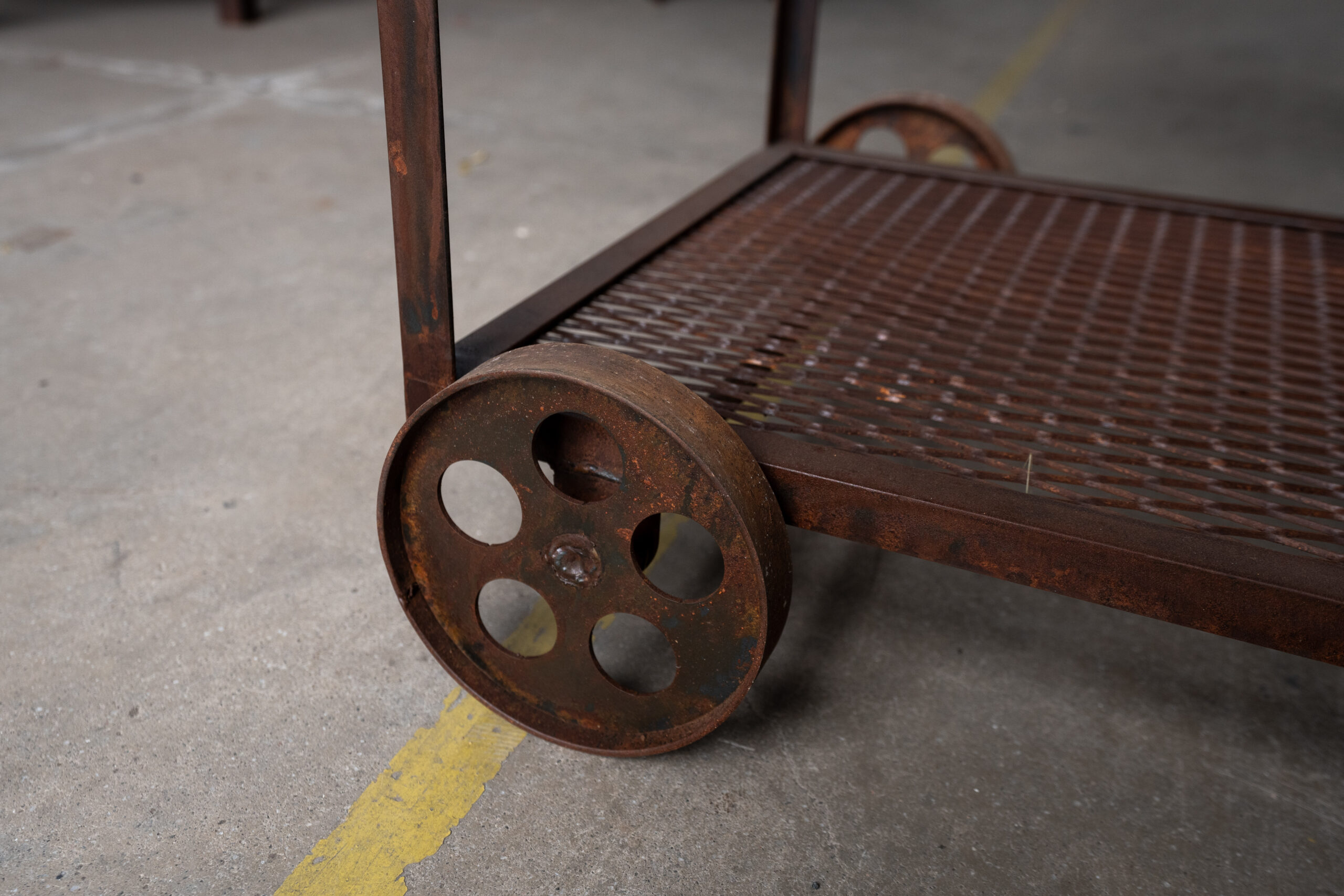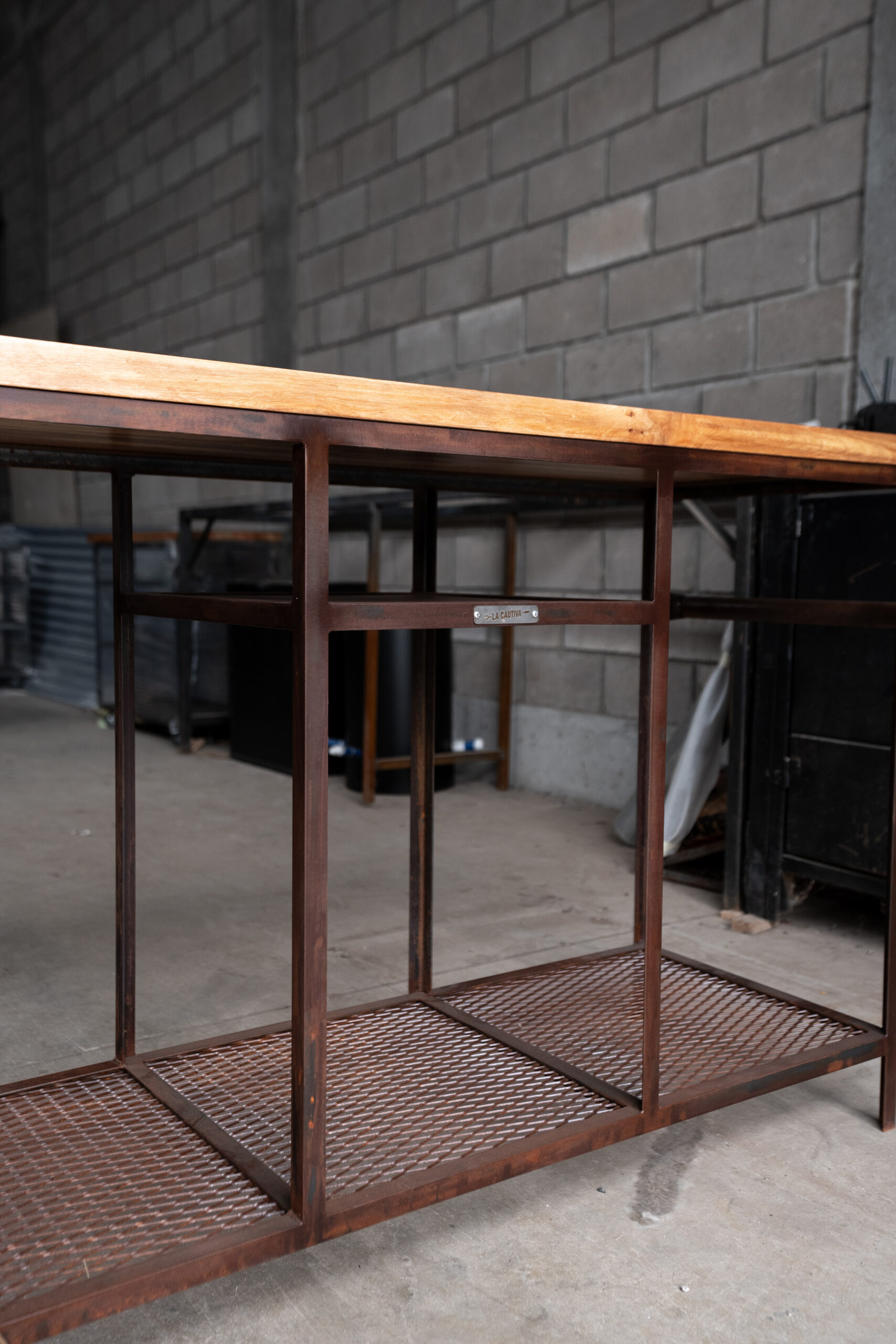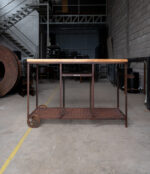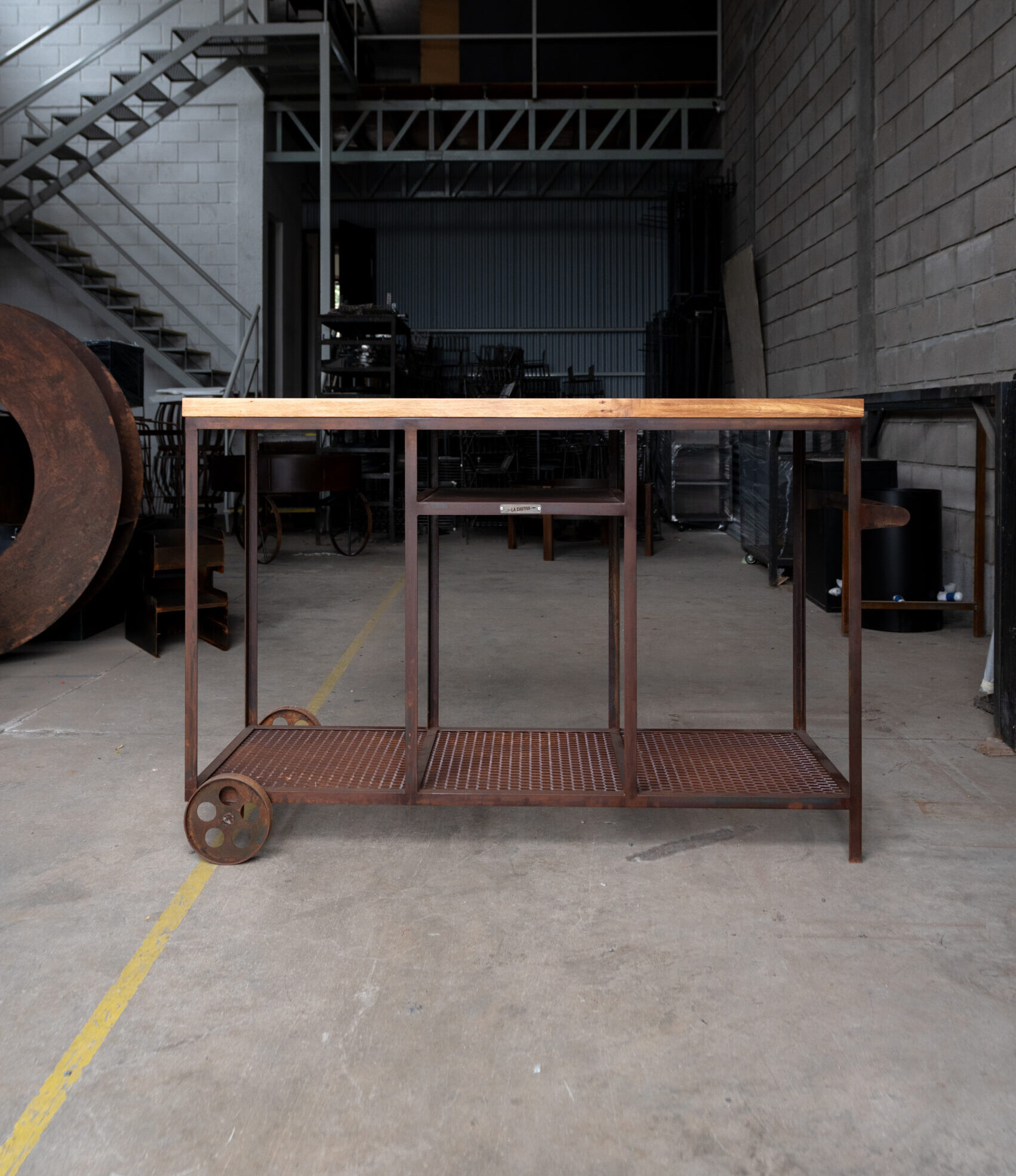 Barra de módulos abiertos con marco de ángulo estructural, base de metal desplegado, tapa de madera nativa y dos ruedas grandes.