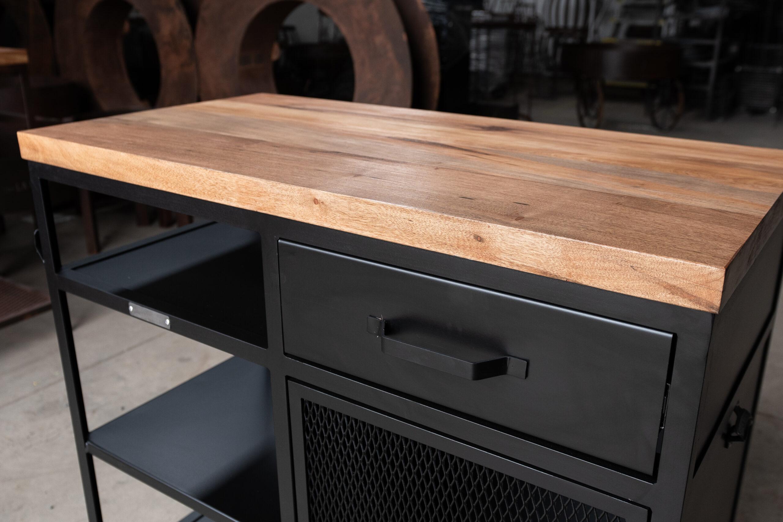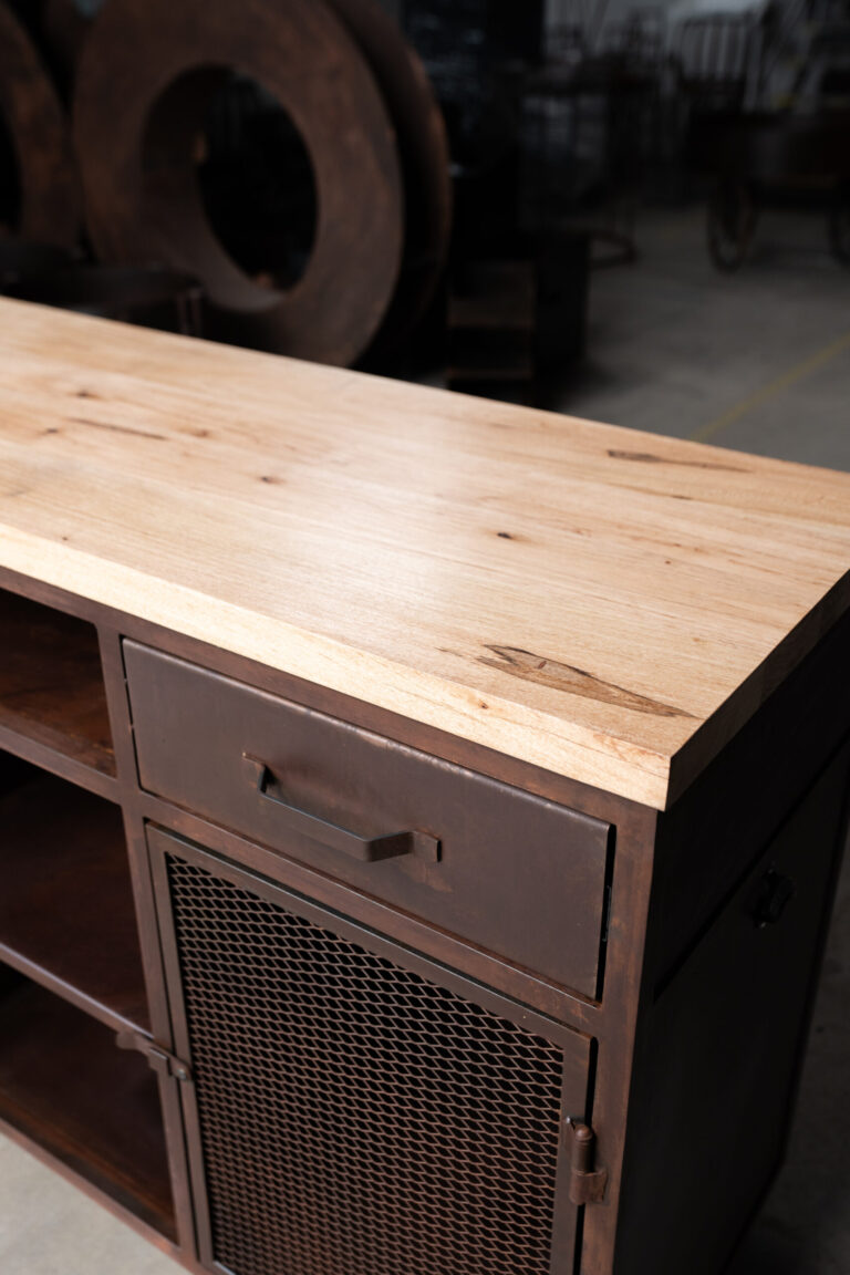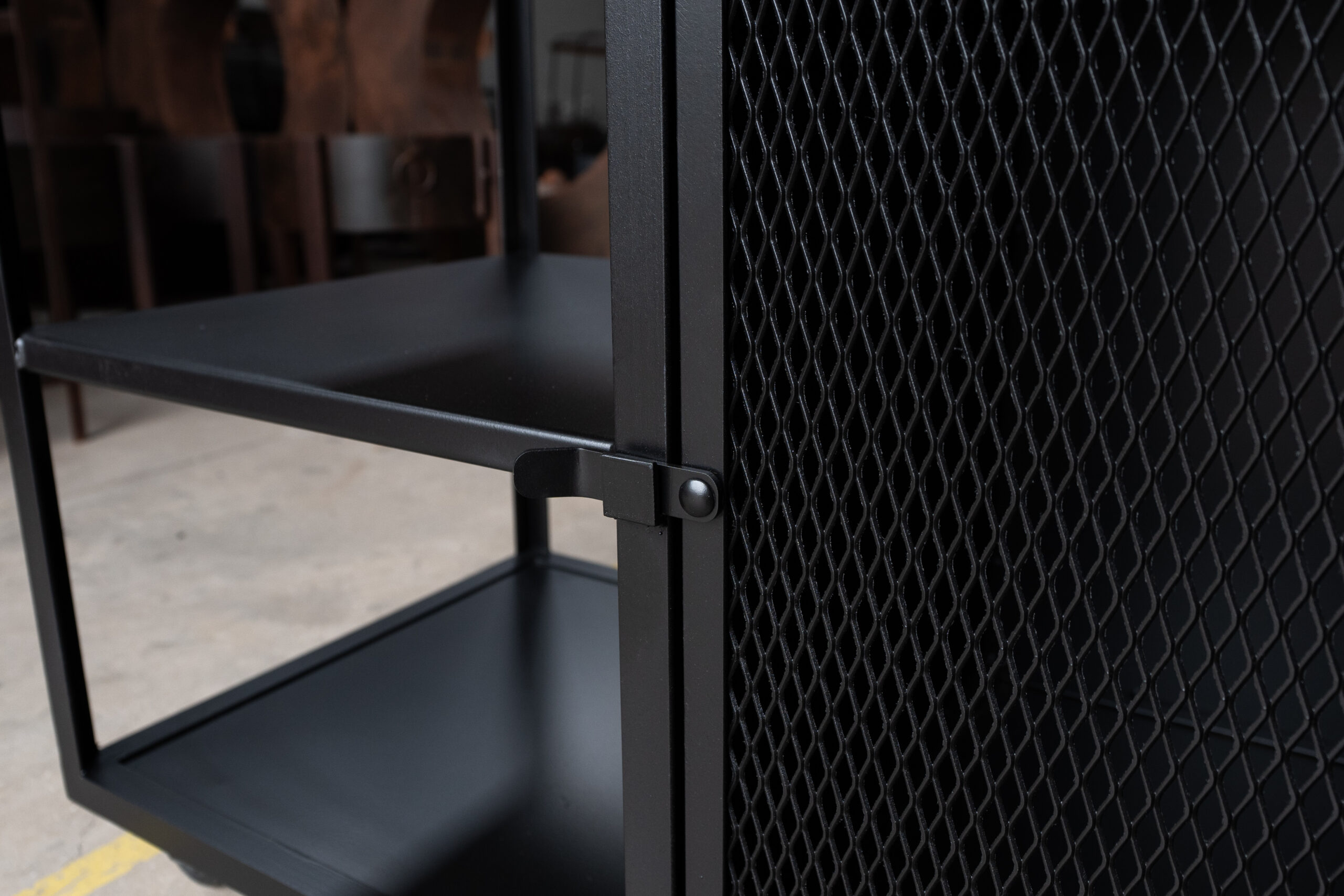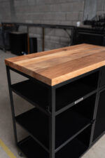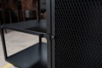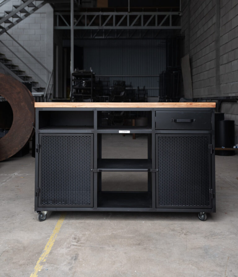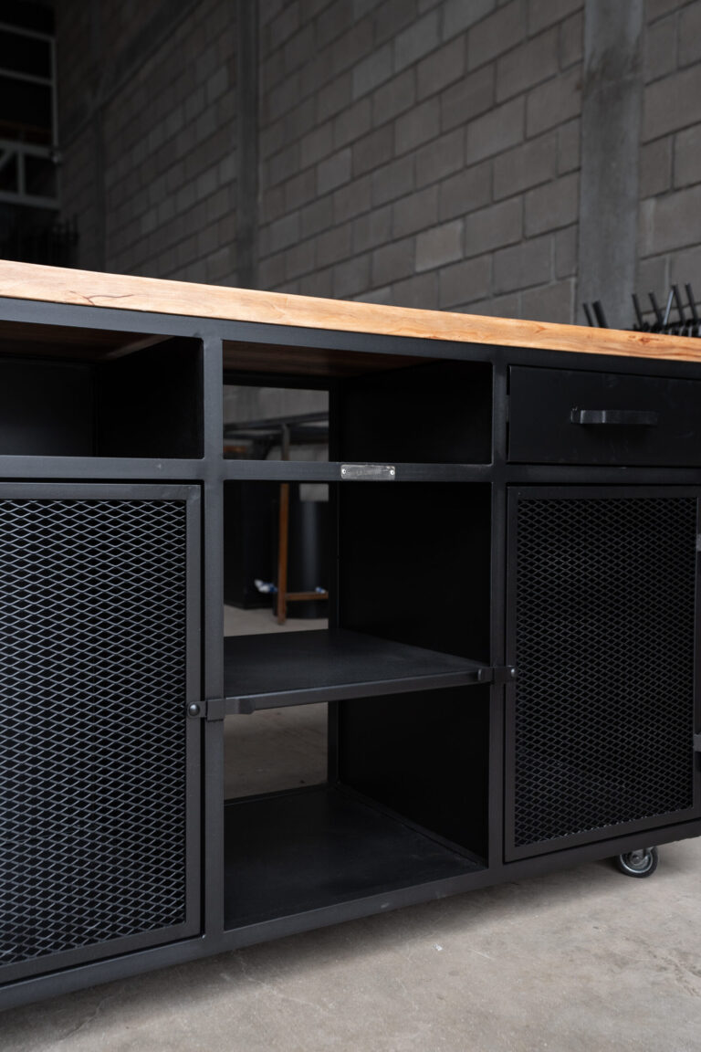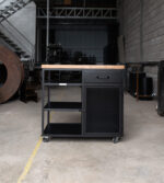 Barra cerrada dos módulos. Un módulo abierto con estantes de chapa y un módulo cerrado con puerta y un cajón de correderas telescópicas. Cuenta con cuatro ruedas de silicona giratorias con freno.