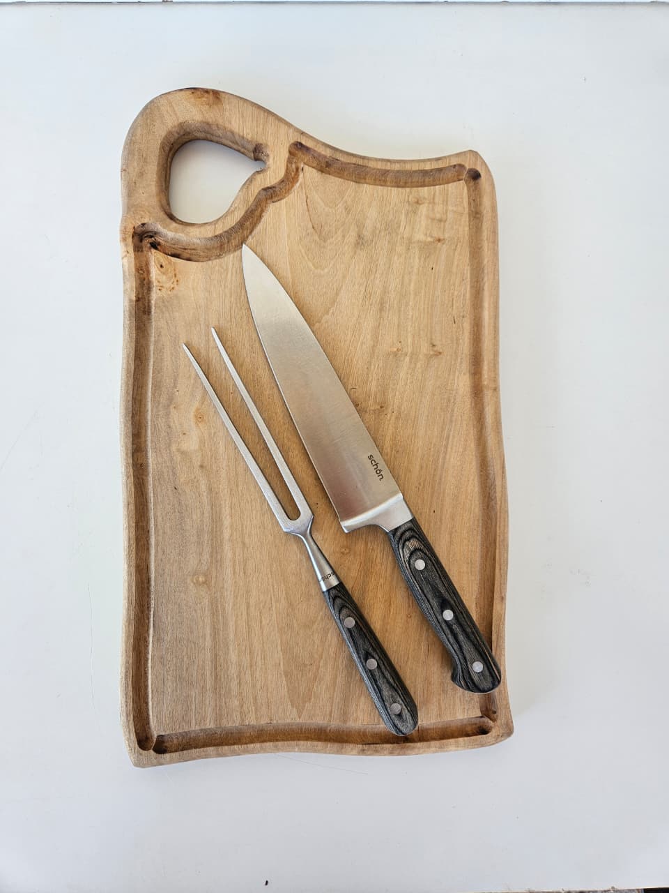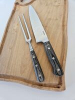 – Set de cuchillo y tenedor cheff de acero inoxidable 430 forjado. Mango madera de Pakka. Medidas: Cuchillo: Largo total: 34cm | Largo de hoja de 21cm | Tenedor: Largo total: 30cm