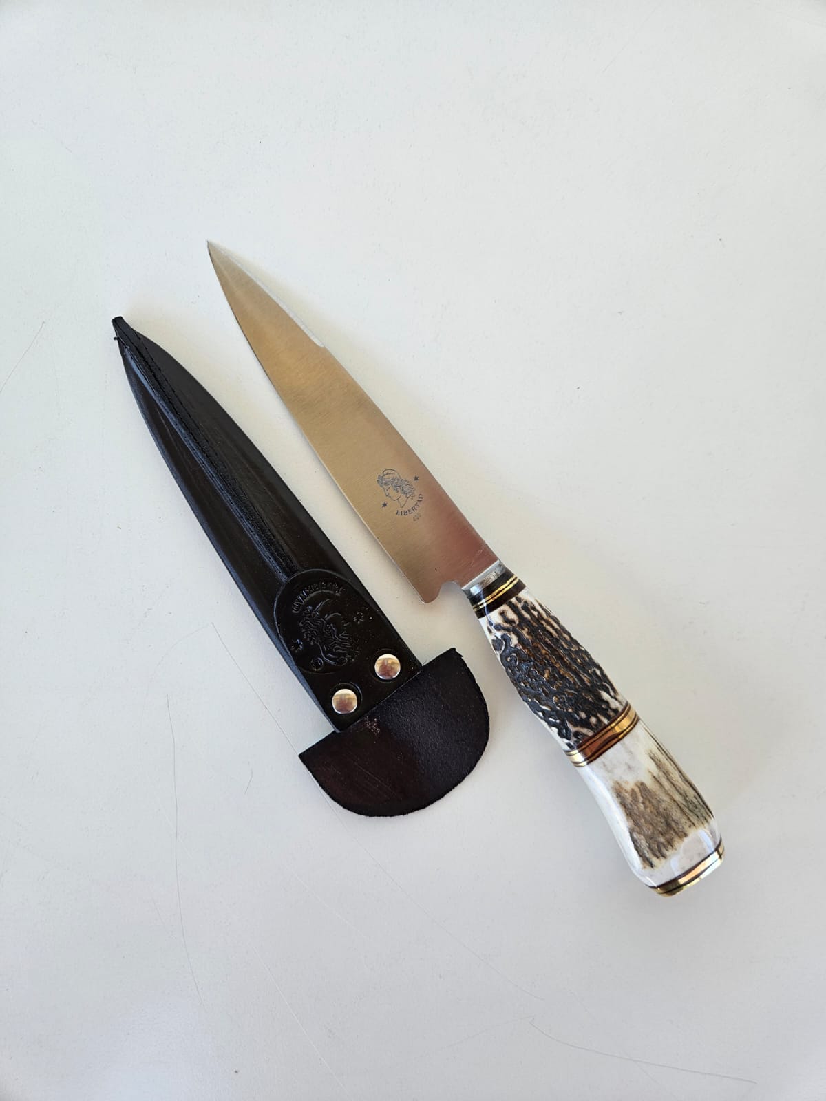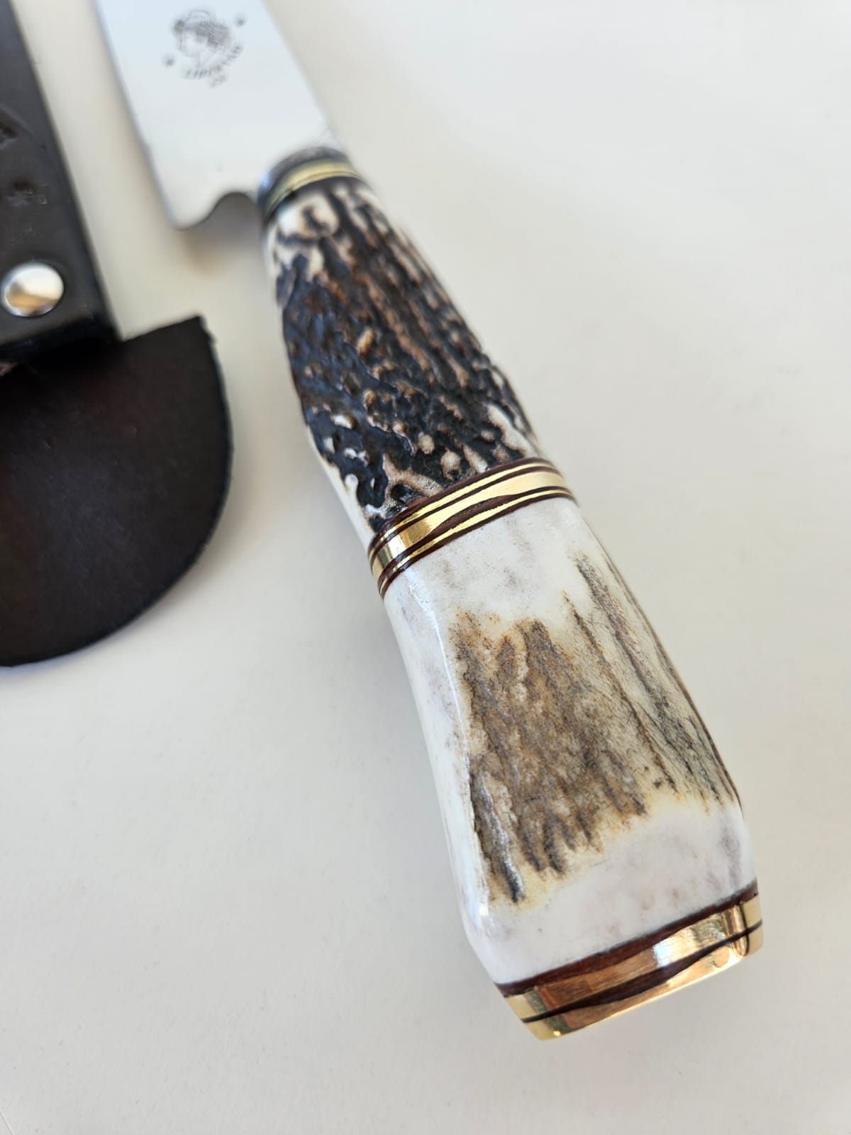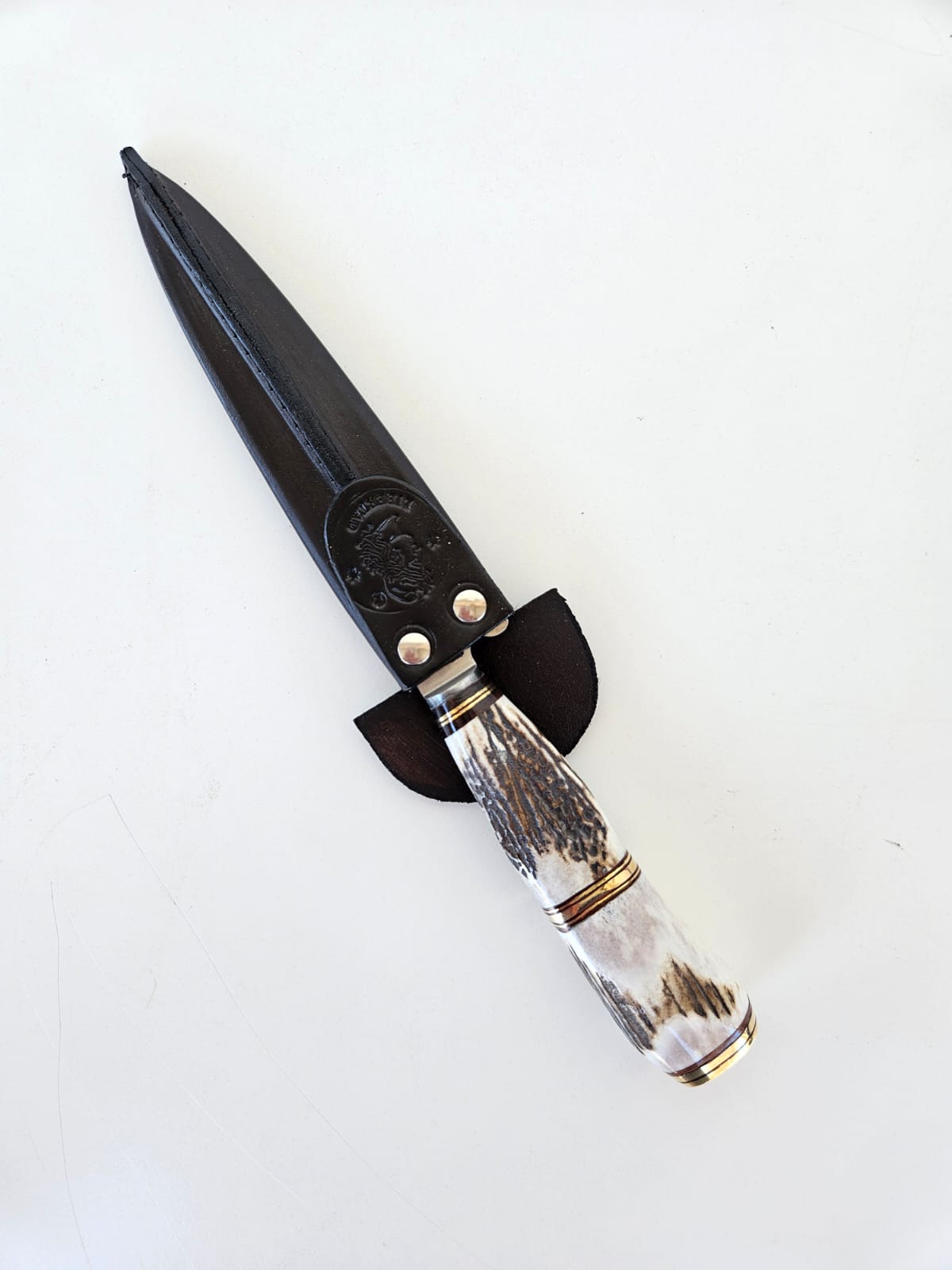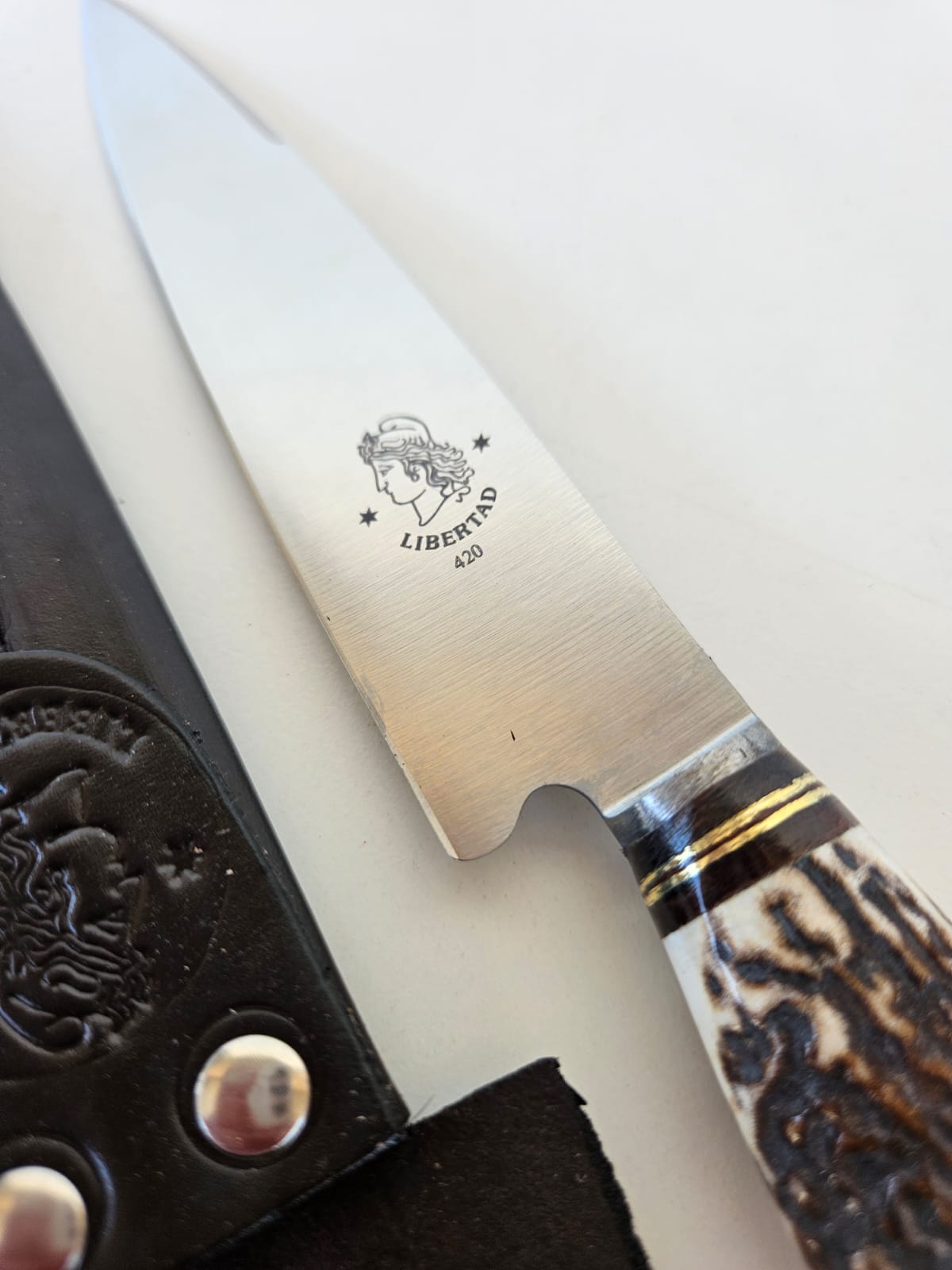 Cuchillo Libertad forjado de acero inoxidable 420. Con cabo en asta de ciervo. Incluye vaina de cuero.