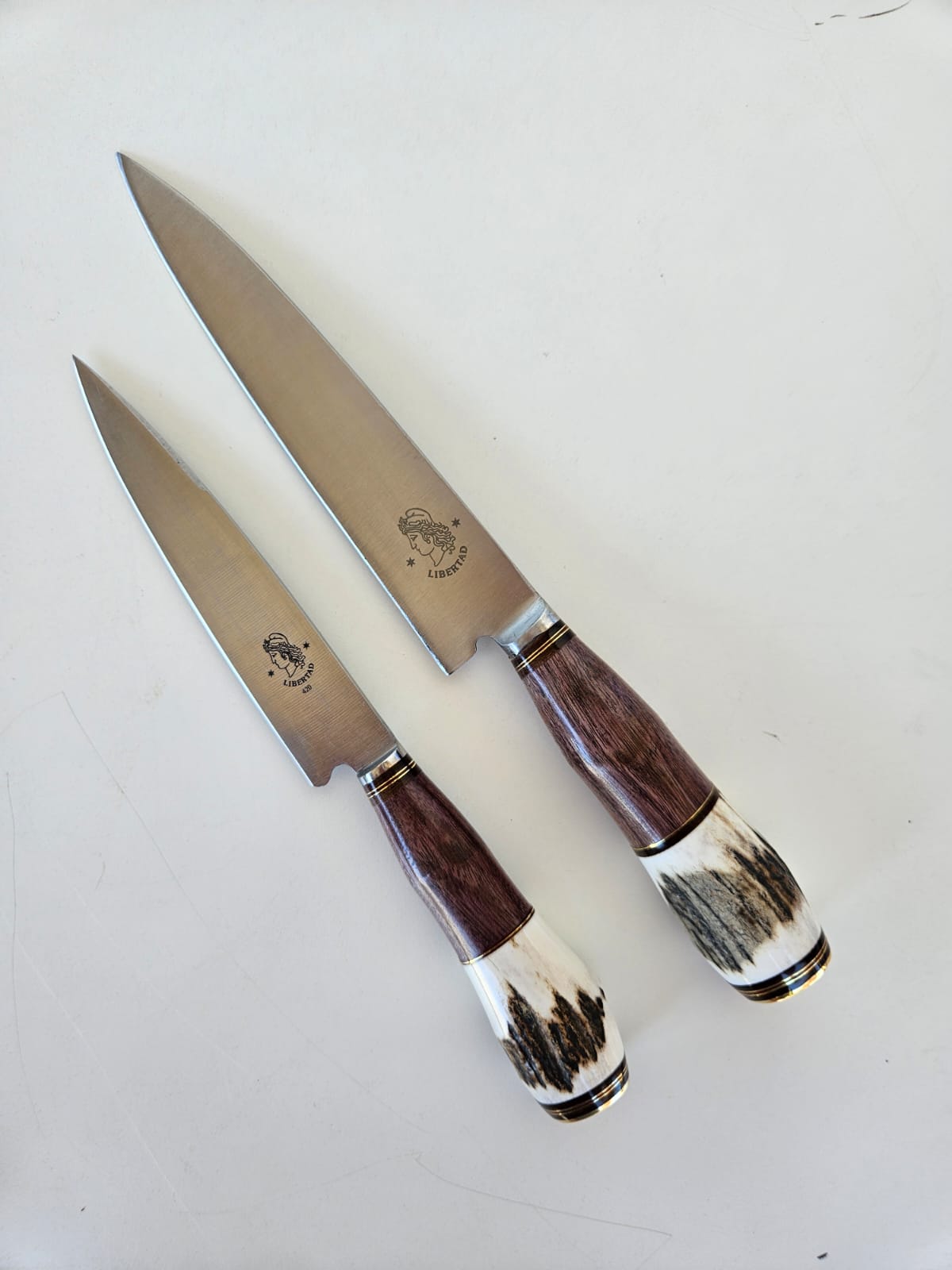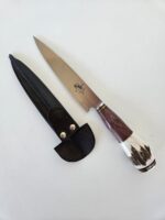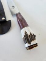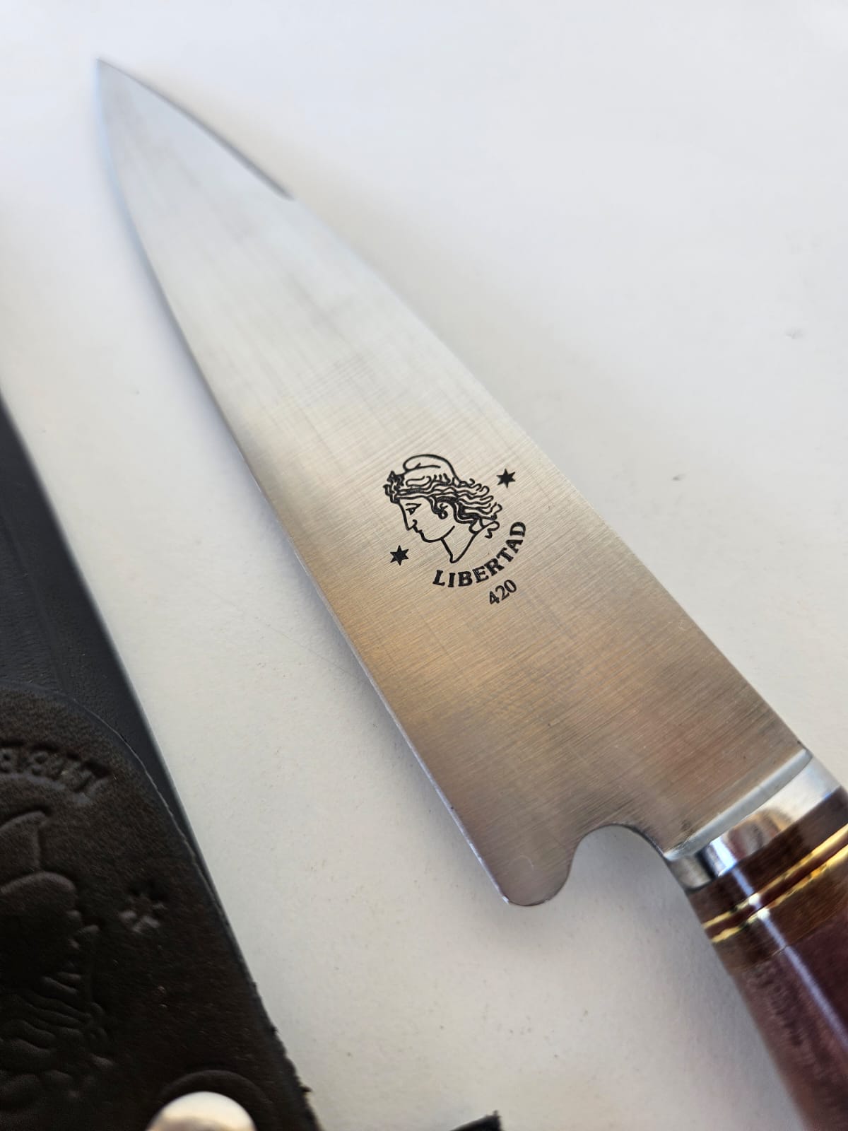 Cuchillo Libertad forjado de acero inoxidable 420. Con cabo combinado en madera y ciervo. Incluye vaina de cuero.