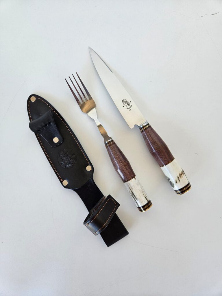 Cuchillo de acero inoxidable forjado. Mango de madera anatómico. Medidas: Chico: 14cm de hoja. Mediano: 16cm de hoja. Grande: 20cm de hoja. Incluye vaina de cuero.