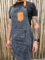 Delantal de jean negro desgastado con tiras y bolsillo de cuero.