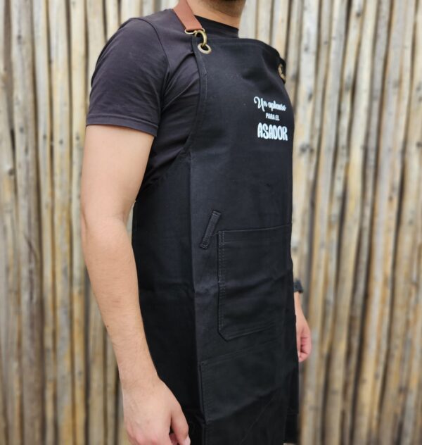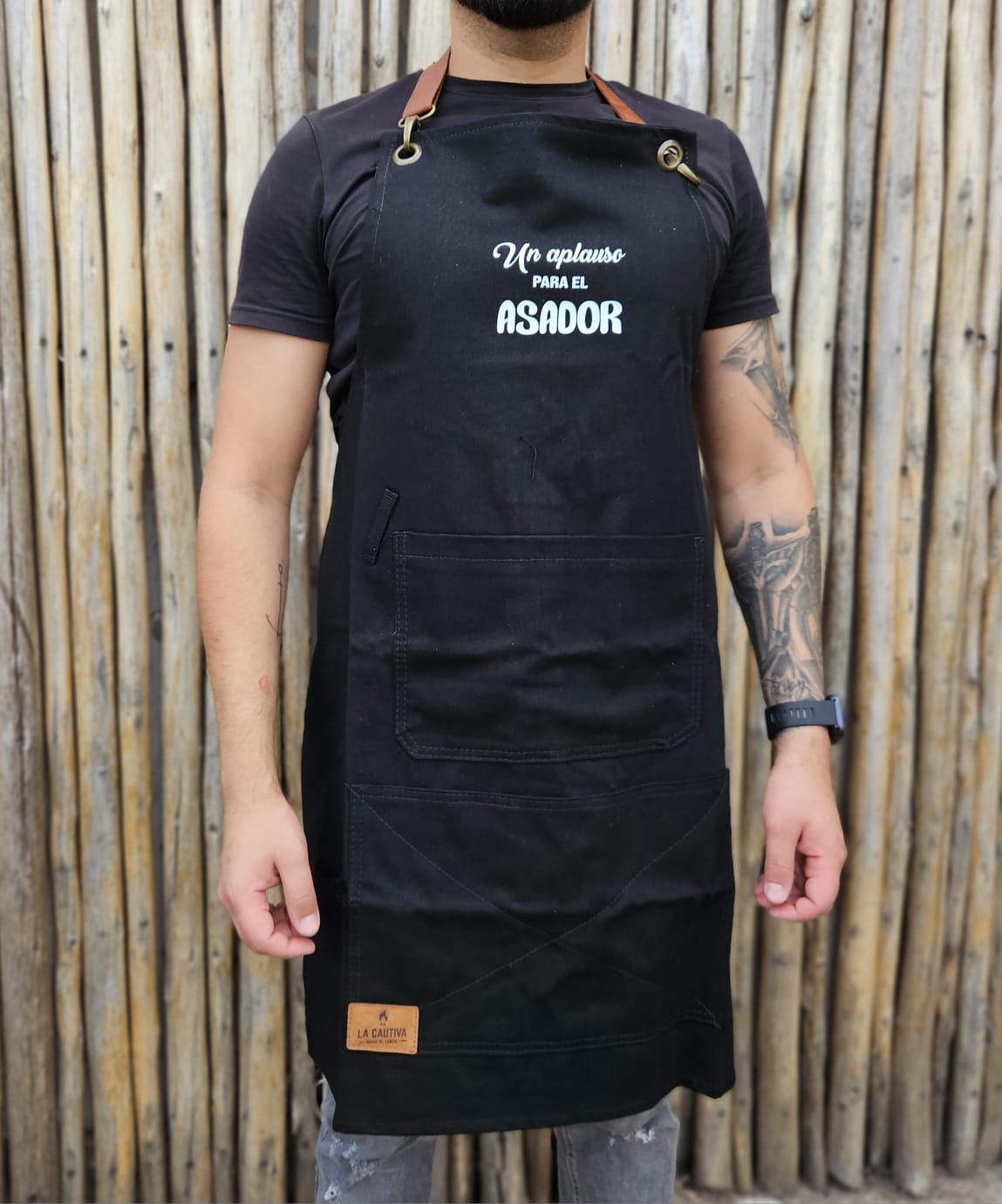 Delantal de jean con tiras de cuero, con frase «un aplauso para el asador».