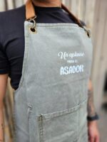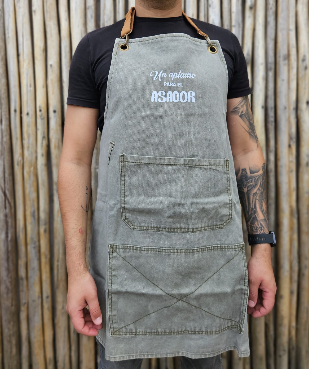 Delantal de jean color verde láser, con frase «un aplauso para el asador»