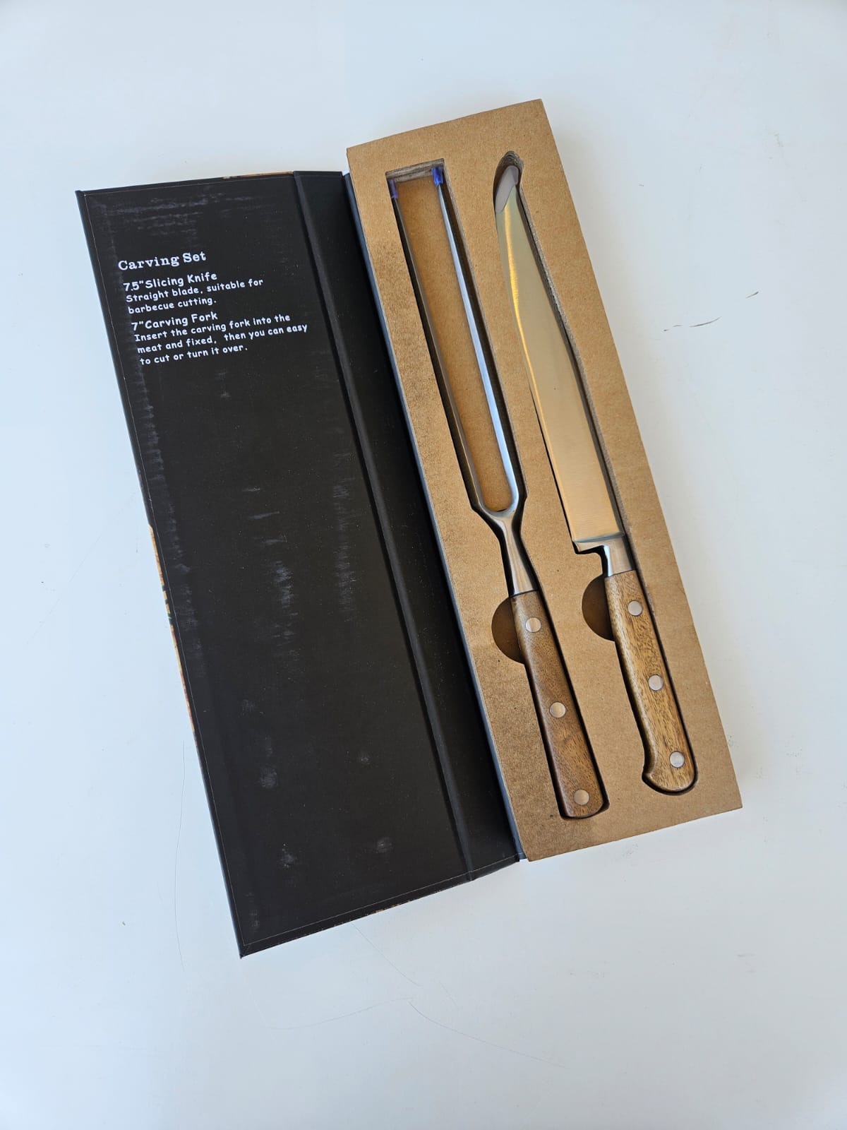 Medidas: largo del cuchillo: 31,5 | Largo del tenedor: 32cm | Apto lavavajillas: No | Packing: Caja de cartón.