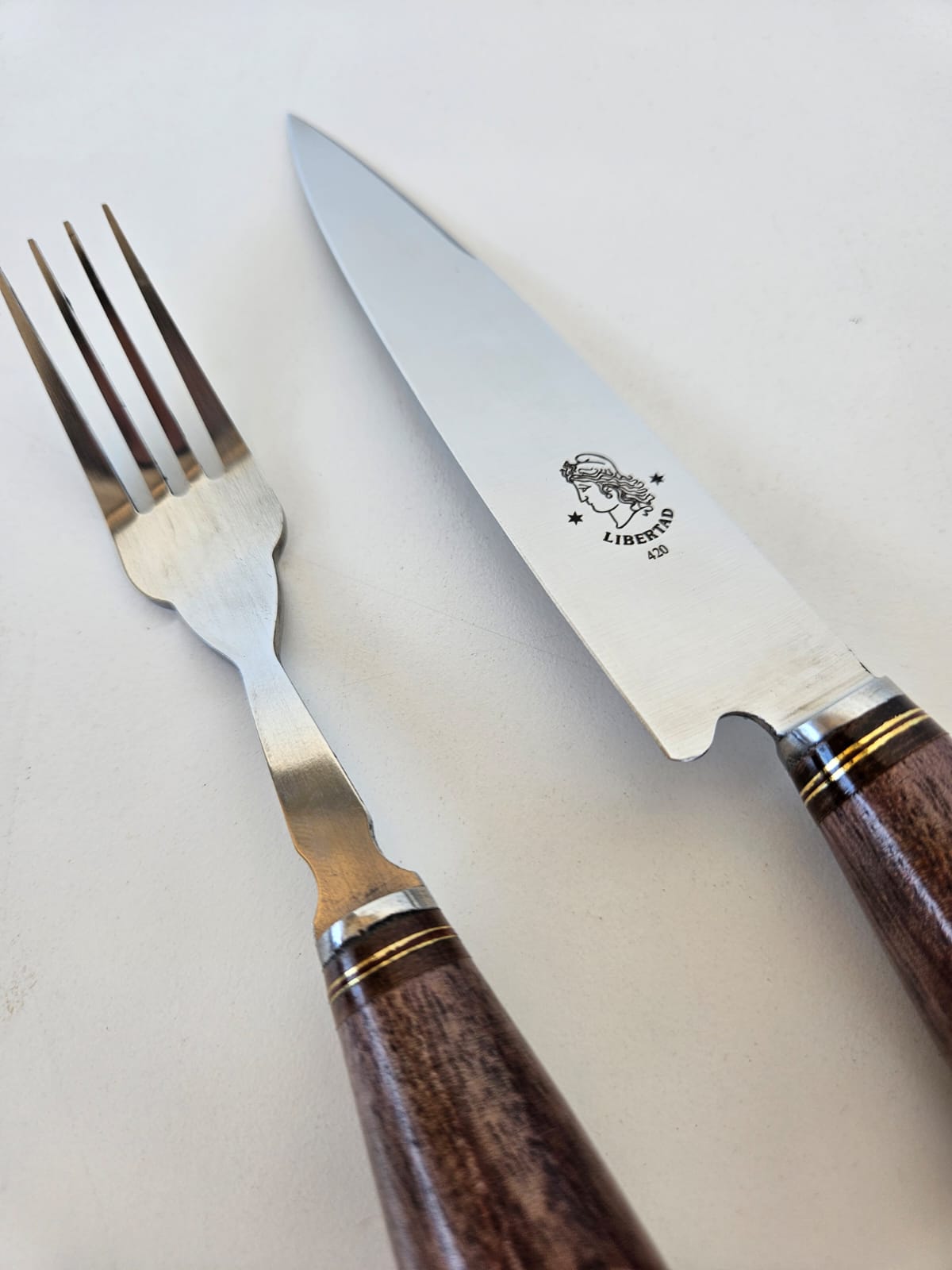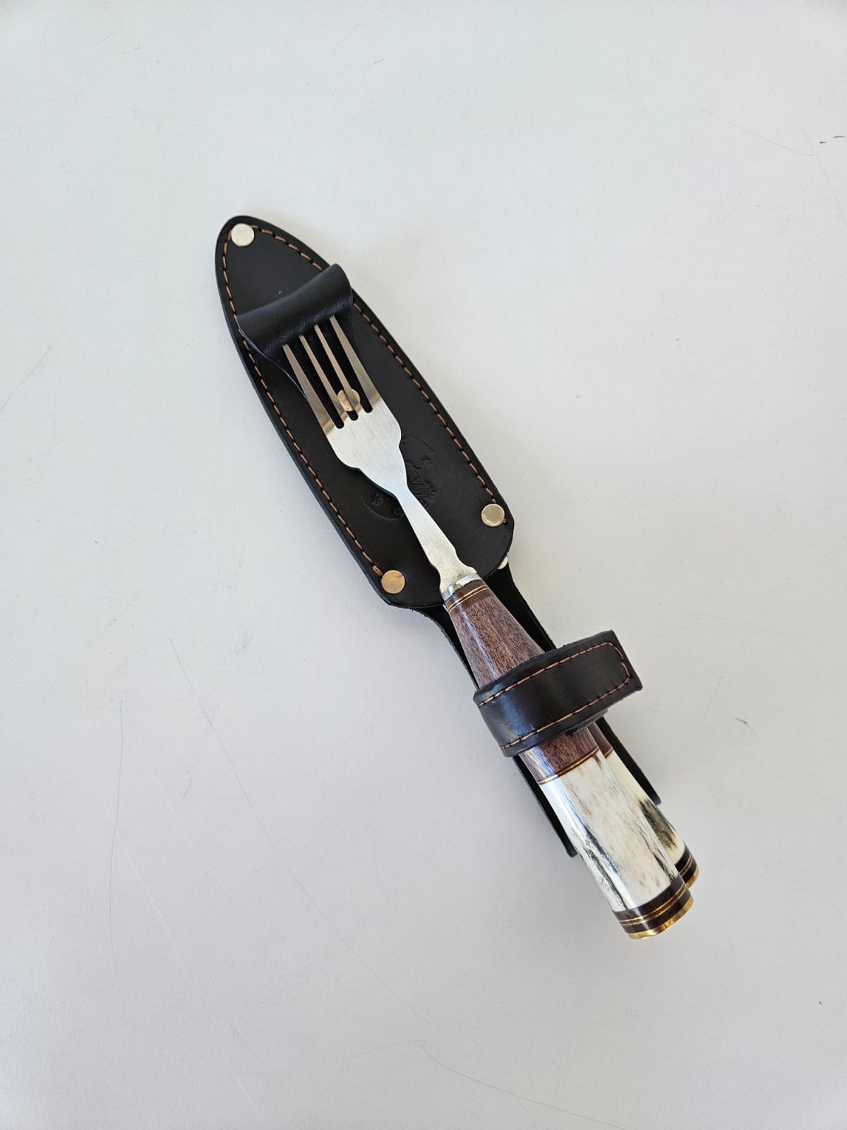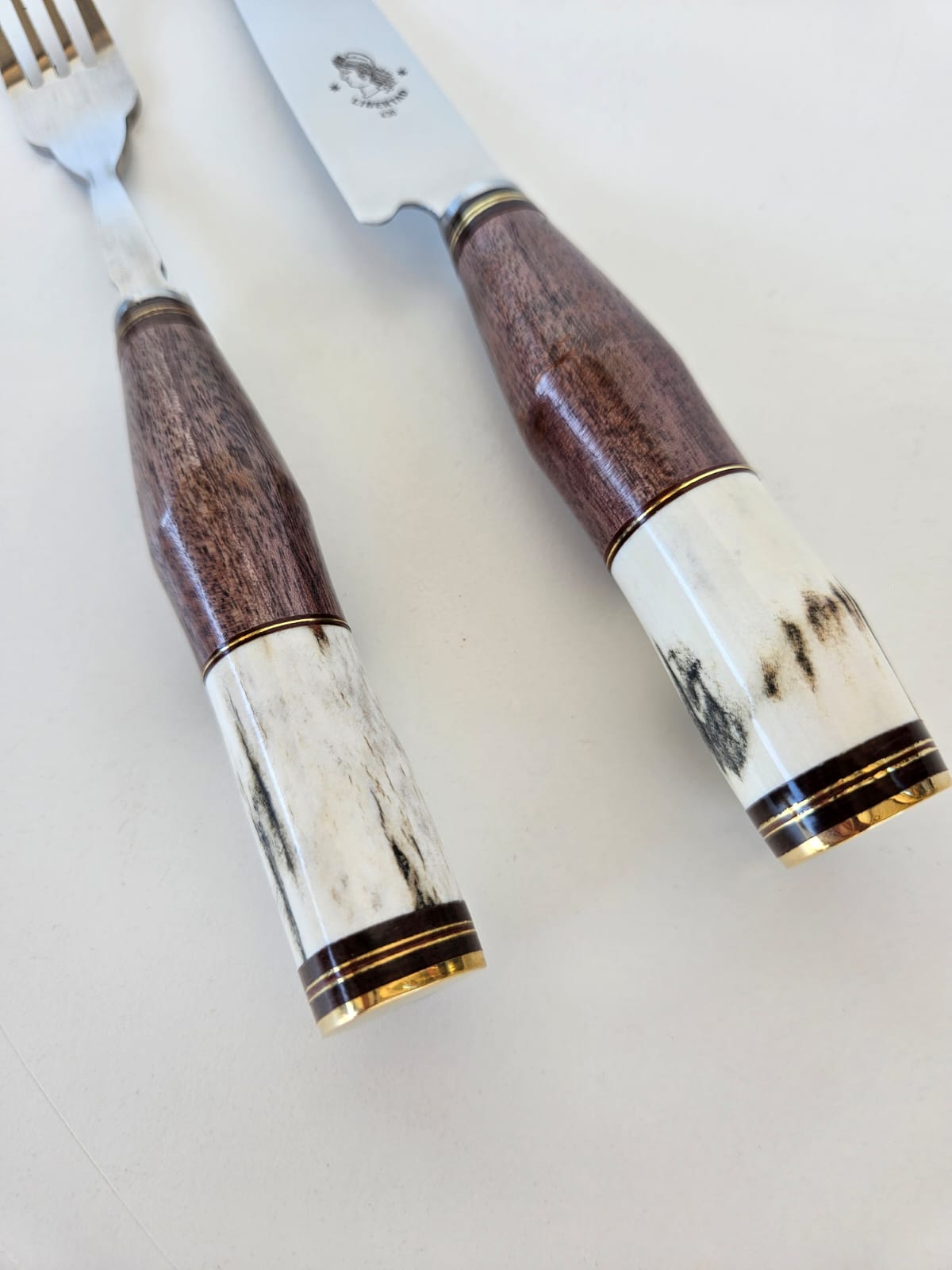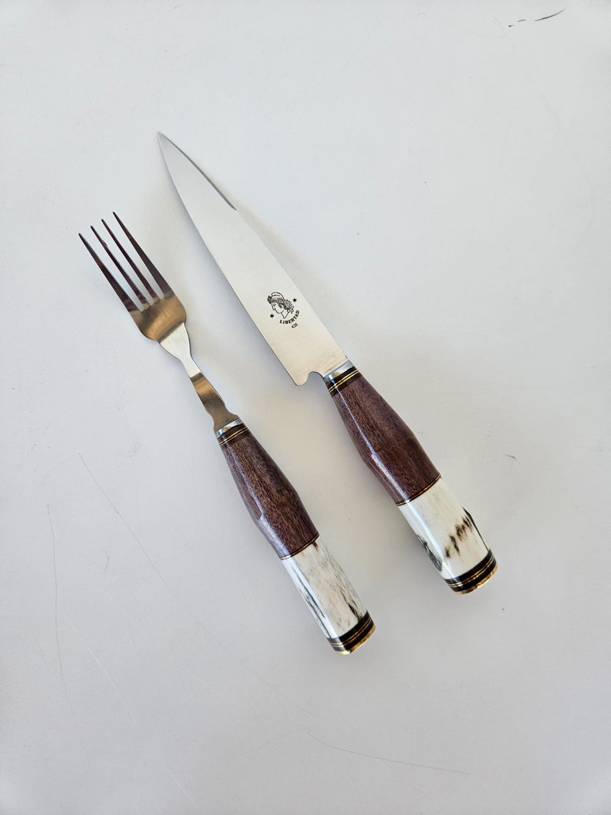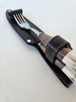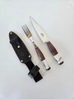 Juego de cuchillo + tenedor Libertad forjado de acero inoxidable 420. Cabo combinado en madera y ciervo. Incluye vaina de cuero.
