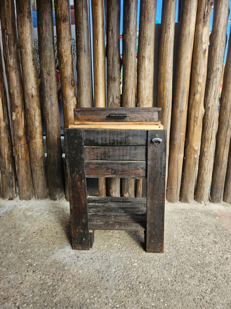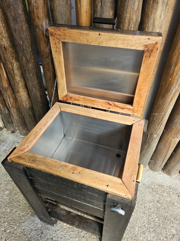 Mesa de madera de pino cuadrada, con frapera de zinc integrada en el centro.