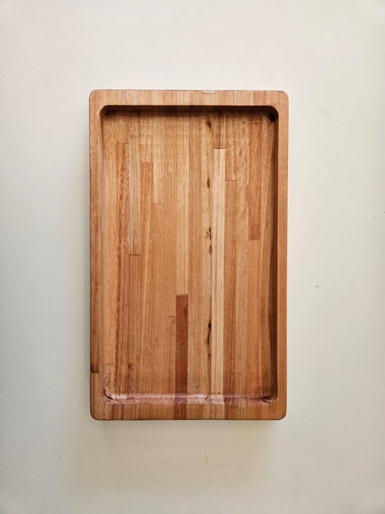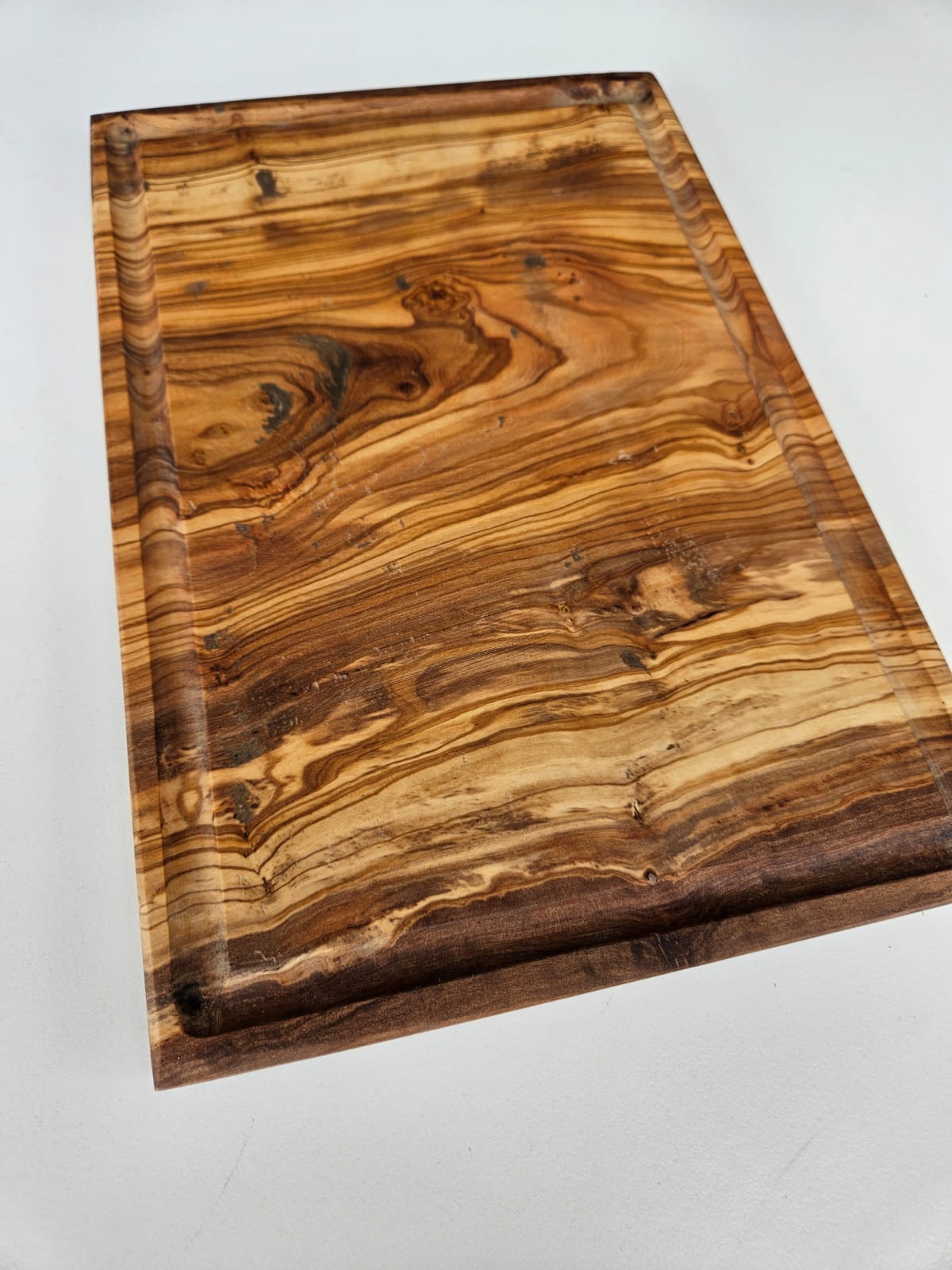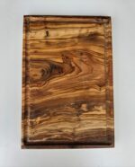 Plato de madera de olivo con canaleta. La madera de olivo es reconocida por poseer propiedades antibacterianas naturales. Son una excelente opción para utensilios de cocina debido a su resistencia a manchas, hongos y olores, así como a su baja porosidad, que evita la absorción de líquidos y sabores. Su veta distintiva con colores que varían del amarillo pálido con vetas marrones negras, la hacen muy atractiva para tablas de cortar y objetos decorativos.