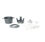 – 1 Olla | 1 pie de hierro | 6 pinchos de acero inoxidable | 1 quemador.