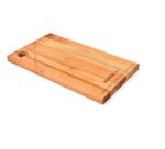 Block de eucalipto compensado de corte útil para picar, cortar, y/o servir alimentos como asados y/o picadas. Se trata de madera ecológica, semidura y de escasa absorción, por el tratamiento que tiene es muy resistente al uso frecuente. La madera no es teñida con ningún colorante artificial, solo curada e impermeabilizada con oleo vegetal. Canal para goteo, útil para recoger los jugos de la carne y/o hortalizas.