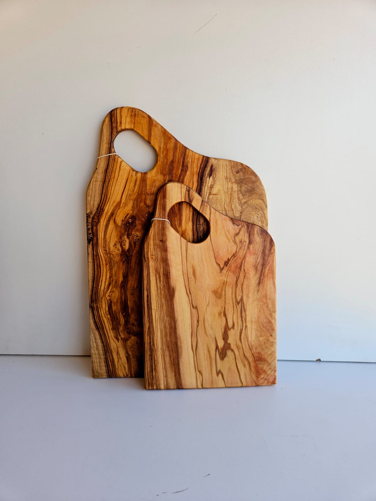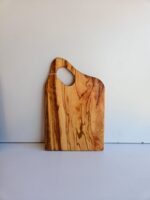 Tabla plana de olivo con manija, ideal para corte. La madera de olivo es reconocida por poseer propiedades antibacterianas naturales. Son una excelente opción para utensilios de cocina debido a su resistencia a manchas, hongos y olores, así como a su baja porosidad, que evita la absorción de líquidos y sabores. Su veta distintiva con colores que varían del amarillo pálido con vetas marrones negras, la hacen muy atractiva para tablas de cortar y objetos decorativos.