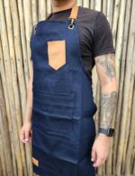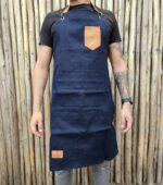Delantal de tela de jean con tiras y bolsillo de cuero.